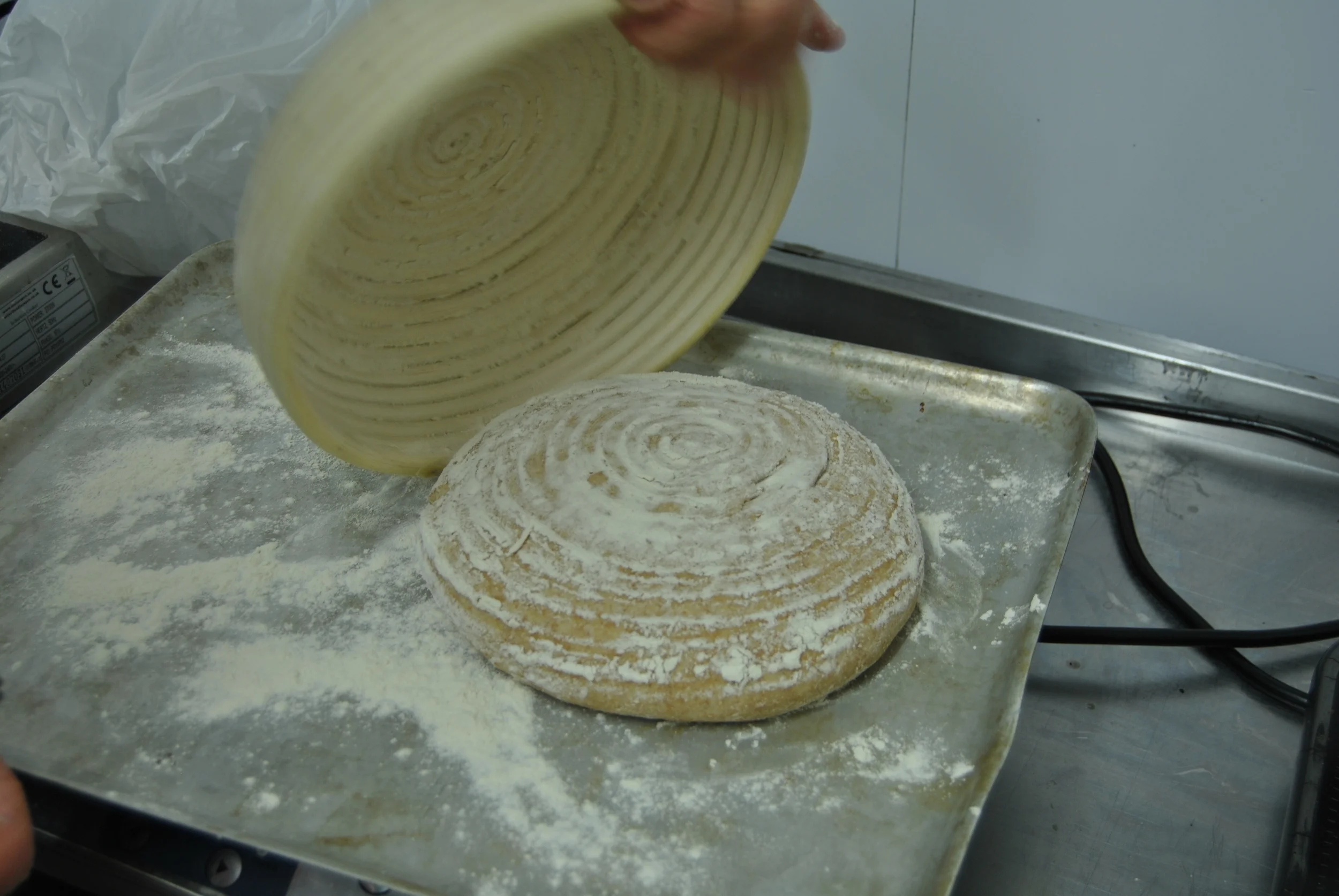 At this point we simply pop the baskets into plastic bags to maintain a moist environment and leave overnight. In the winter the cool kitchen temperature (approx 10C°) is ideal for a slow development over 12 hours so that first job at 7am is to turn out and bake. If your kitchen is warmer over night you will need to find a cooler place (or warm fridge) to ensure the dough does not over develop in this longer peroiod.