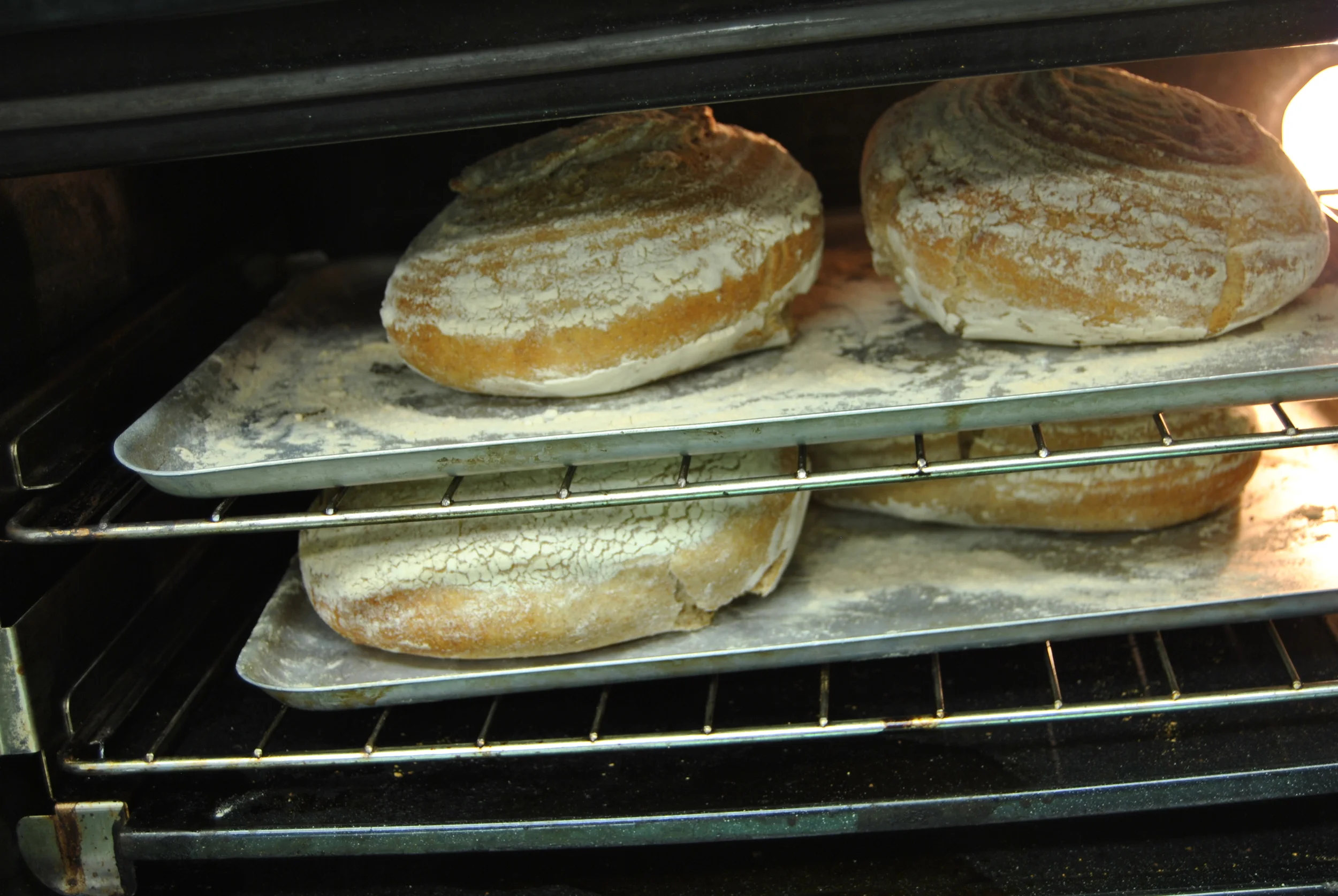 After 10 minutes baking we turn the oven down to 180C° and cook for another 20-30 minutes. You are looking for a good dark colour (develops flavour as sugars are caramelised) and a hollow sound when you tap the base of the cooked loaf to judge when it is ready.