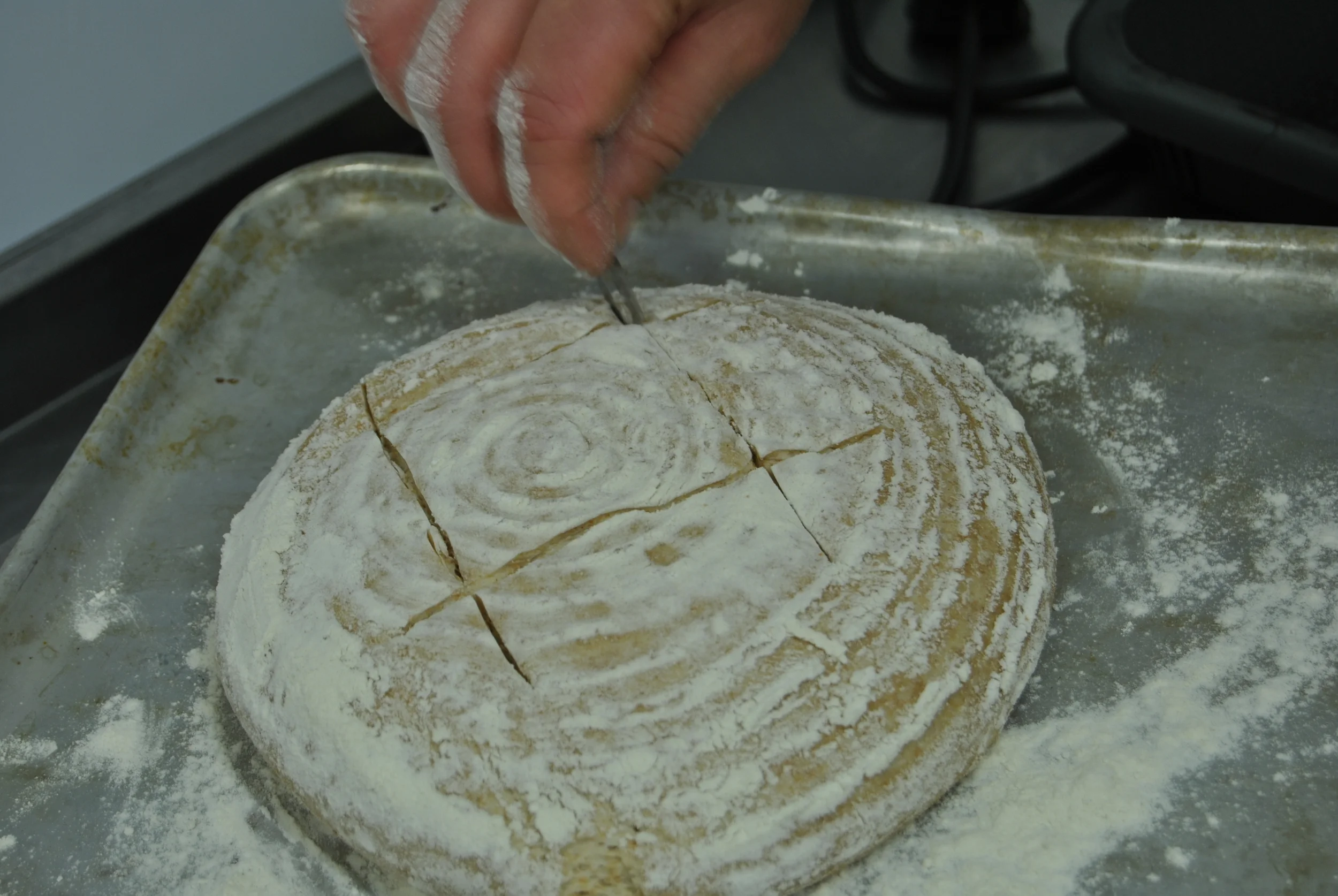 So first thing in the moring we prepare to bake. We get an oven to 220C° with a tray of boiling water on the lowest shelf. We then turn out the bread onto floured baking trays and cut the surface in a simple pattern with a razor blade. This helps form a good crust as well as giving a lovely final appearrance.